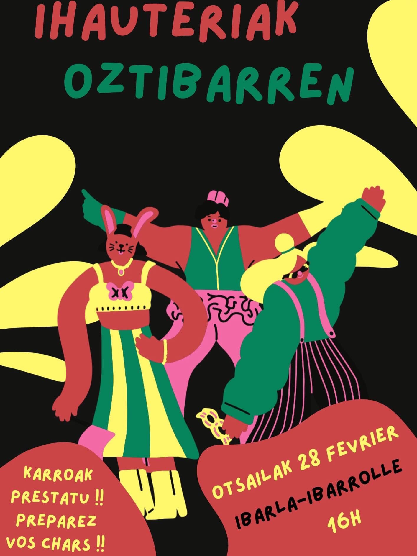 Bestalde, otsailaren 28an ihauteriak ospatuko dira Ibarlan, arratsaldeko 4etatik goiti. Bunuztar Xoriak dantza taldekoek Oztibarreko pesta komite eta elkarteak gomitatu dituzte karroen egiteko. Desfile alai eta koloretsua izanen da, Ibarlako plazatik abiatuko dena, karroekin, Iparralai-ko musikariekin, dantzariekin eta Oztibarreko Basandereak joaldun taldearekin.